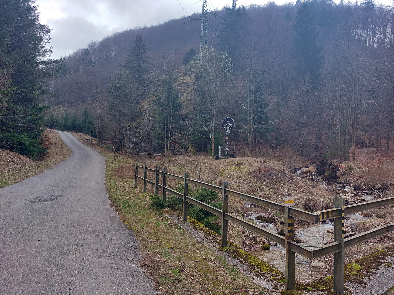 Dolinka pekná, pomedzi stále holé stromy pekné výhľady na bralnaté svahy. Zimný posyp na ceste ešte v hojných množstvách síce, ale zo stopy vyhádzaný autami, no proste paráda! Takéto cesty, čím po nich človek ide hlbšie do lesa, tým sú horšie, tu ale presne naopak – a dokonca posledný, superstrmý kilometer pod Mojtínom čisto nová cesta. Len bolo treba kolesá správne smerovať, kolmo cez široké odtokové jarky :-) Ako bonus ale nádherné skalné steny nad hlavou, no radosť sa trápiť. Lebo na tých 18% (podľa značky) mi zúfalo chýbali prevody, ale najmä nohy.