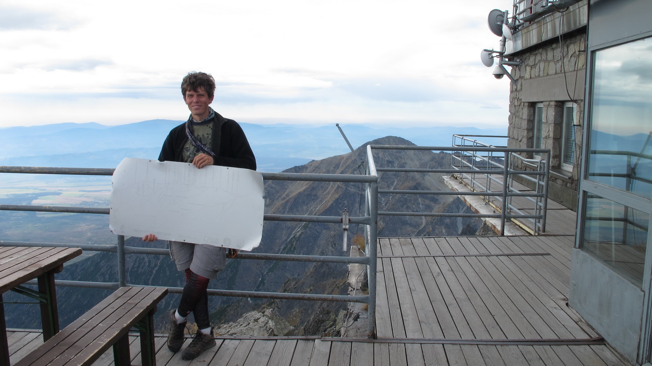 Vyviezli sme sa prvou lanovkou na Skalnaté pleso a vzápätí prvou sedačkou do Lomnického sedla. Odtiaľ sme si to už nasmerovali plní energie po ľahko nabratej výške smer Lomničák. Matúš využil dokonca túto energiu na to, aby vyniesol hore veľkú tabuľu, ktorú našiel v žľabe. Vietor ju musel z vrchola strhnúť a nikto tu o ňu nejavil záujem.