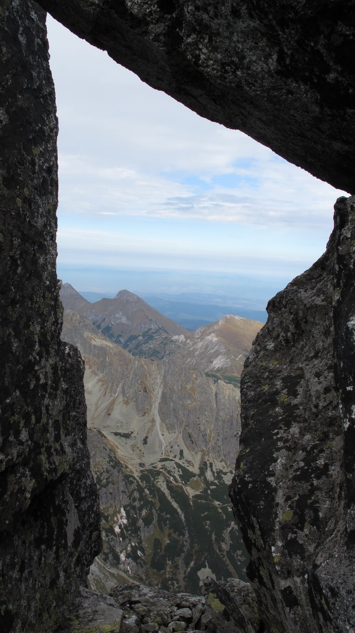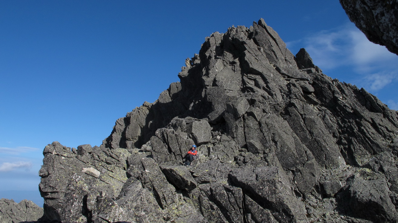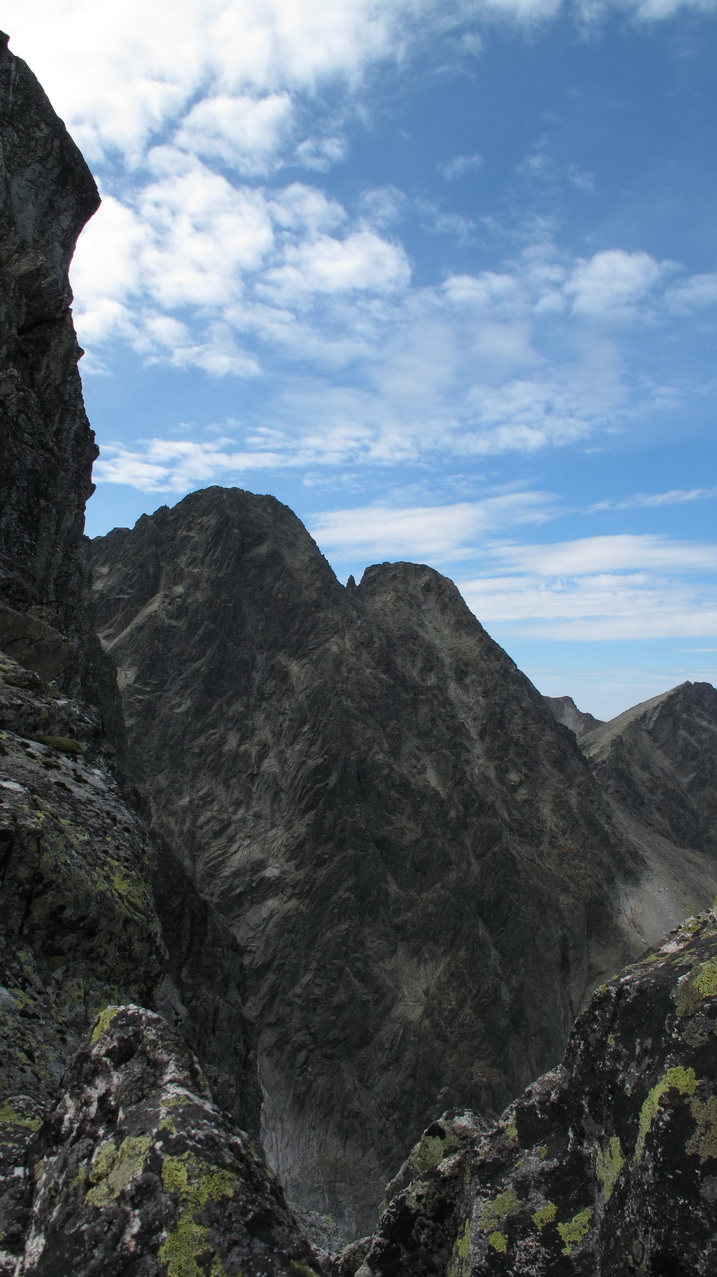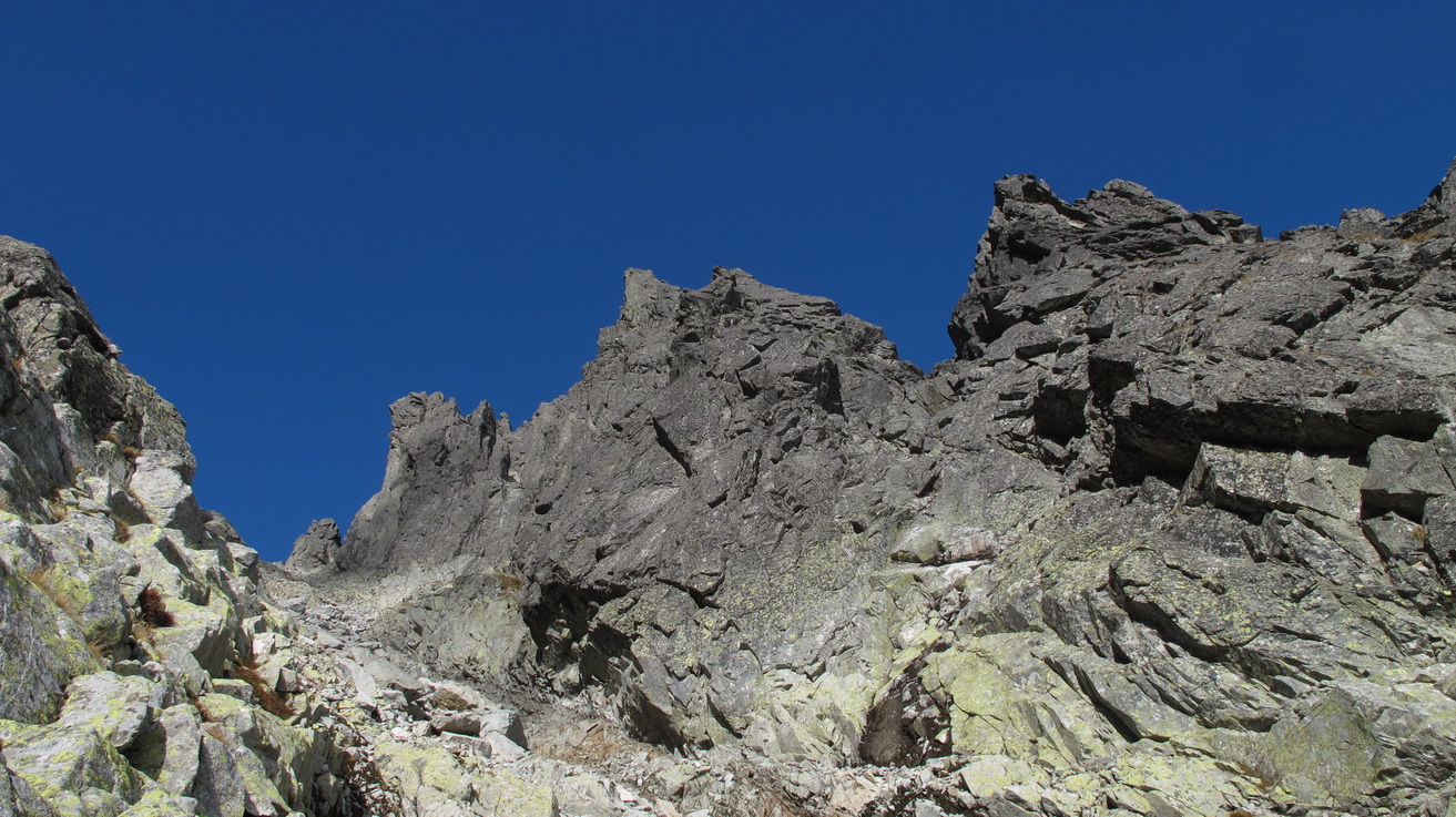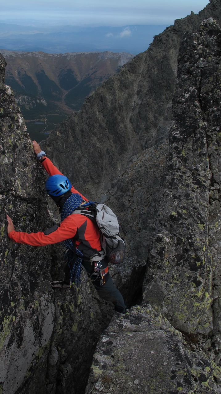 Krásny hrebienok pod vežou zliezame. Sme v Kežmarskej štrbine. Odtiaľto sa dá vyjsť na Kežmarák suťovým žľabom vľavo, ale my sa rozhodujeme pre krásne lezenie pilierom vpravo. Lezieme bez lana. Je to krásne ísť takto hore, ničím neobmedzovaný. Je to tu ľahké. Expozícia nie je až taká strašná.