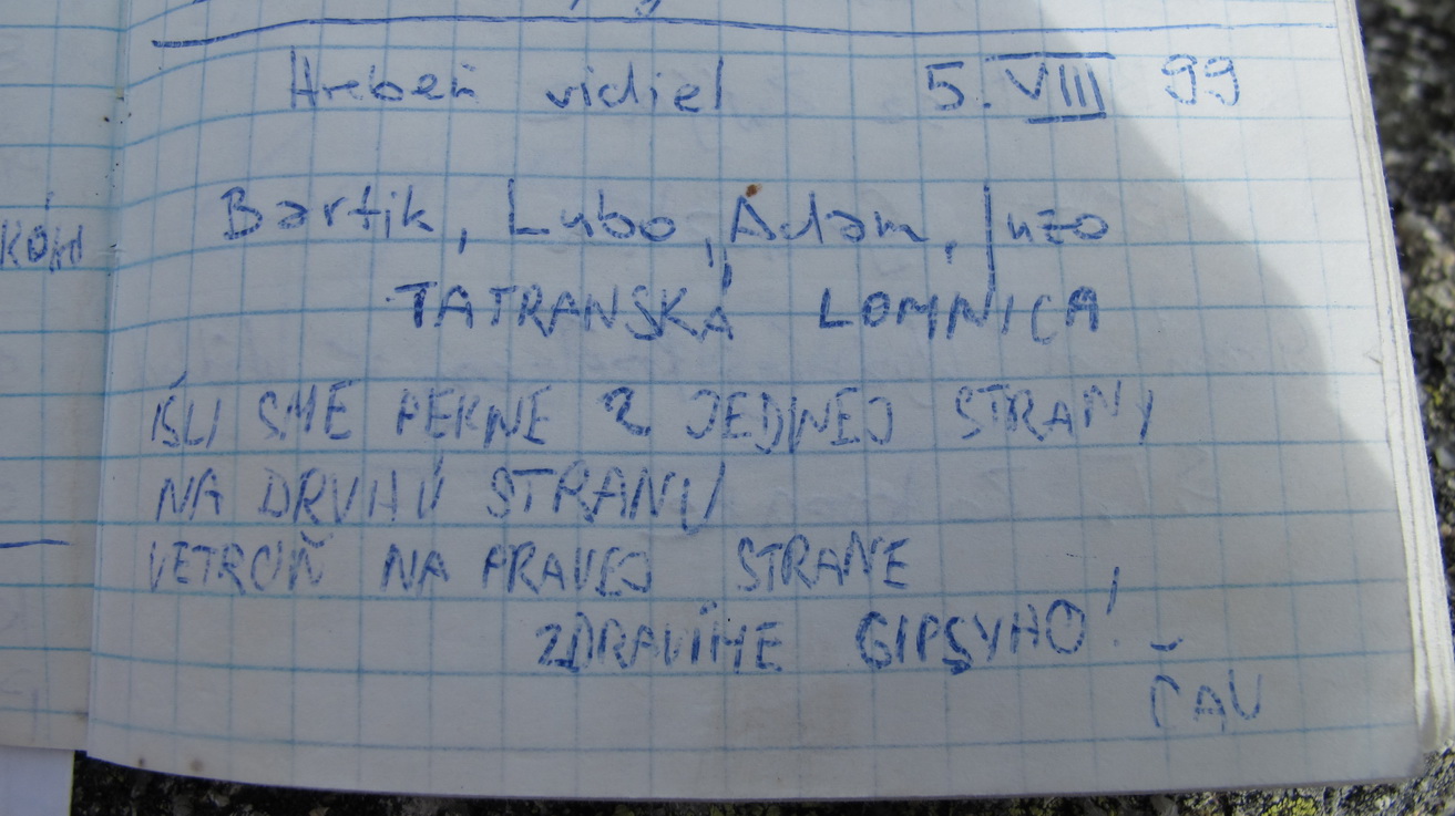 Zápisov v knižke nie je veľa. Vzhľadom na to, že drvivá väčšina ľudí tadiaľto ide v zhone a rýchlosti, lebo sa ponáhľajú na lanovku, tak sa asi viacerí nestihnú zapísať. Nachádzam náš zápis v knižke spred 12 rokov. Sú to pekné pocity. Čítam čo sme vtedy napísali a uvedomujem si, že sa za ten čas sa na mojich prioritách a zásadách nič prevratné nezmenilo...