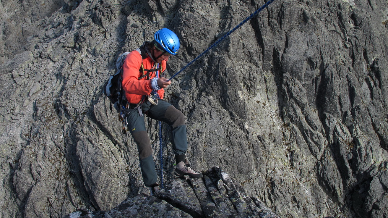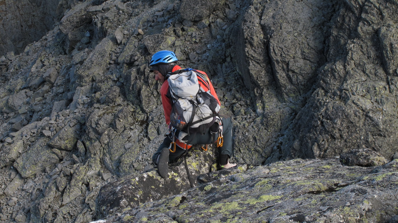 Zliezli sme cez "Botanickú záhradu" ľahkým terénom do Medenej štrbiny. Tu začína hrebeňovka ostrým hrebienkom. Vietor ale fúkať neprestal. Rukavice sme si nechali na rukách a začali sme liezť. Na prvom úseku sme dali len jeden krátky zlaňák cez skalný zub, ináč sme liezli bez lana.