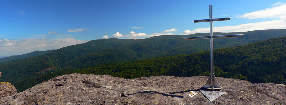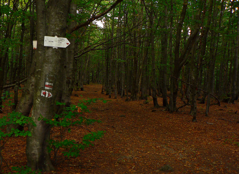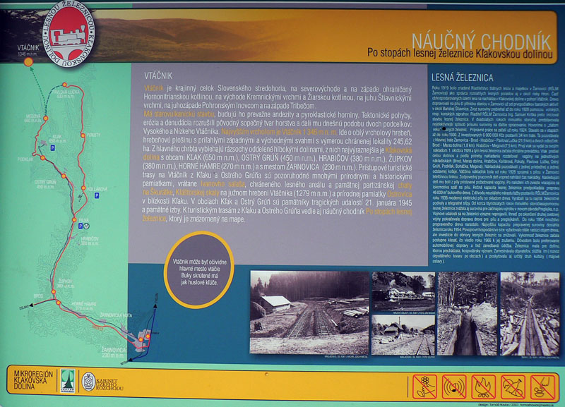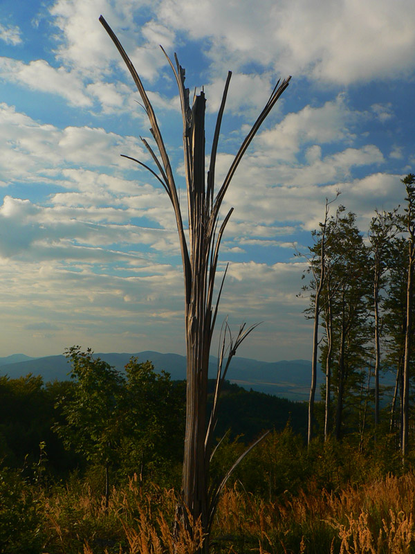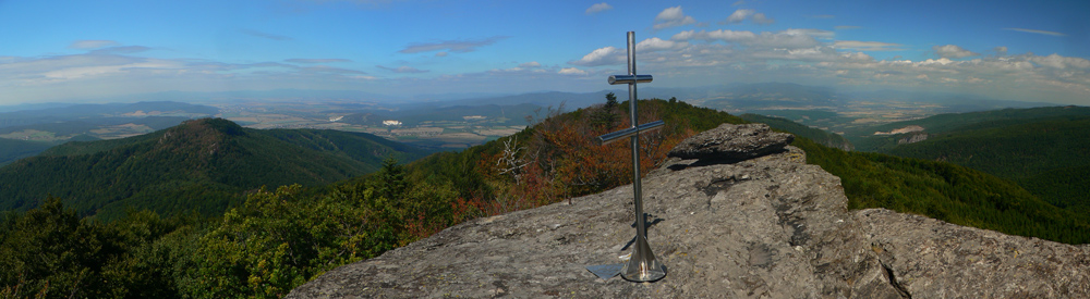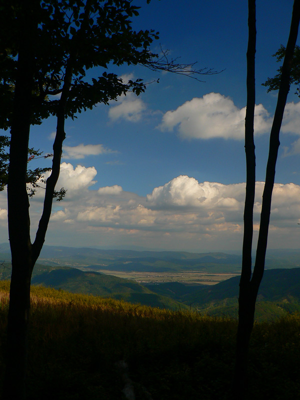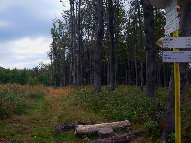 Sem - tam sa ale z toho tunela podarí vynoriť. Napríklad na Kláštorskej skale, krásny kruhový výhľad! Myslím že aj Zobor na juhu sa mi črtal v opare. Samotný Vtáčnik (1346m) je hneď vedľa - ponúka výhľady spod kríža, hlavne na severný horizont . Potom už si pamätám len jediný ďiaľkový pohľad - na Žiar nad Hronom, vďaka rúbanisku z doliny až po hrebeň, niekde pred Bielym kameňom. Škoda že o kus ďalej, na smerovníku pod Bielym kameňom nie je vyznačená vyhliadka. A až po Veľký Grič heslo „vyber si svoju zvážnicu“. Myslím že vždy po tej najširšej bolo treba ísť :-) Tu sa hádam ani v noci zablúdiť nedá, asi jediné miesto je pri Jarabej skale. Tam červená pri vysielači odbočuje zo zvážnice doprava na lesný chodník. Bolo by to nenápadné, nebyť smerovníka – ten si hádam každý všimne.
