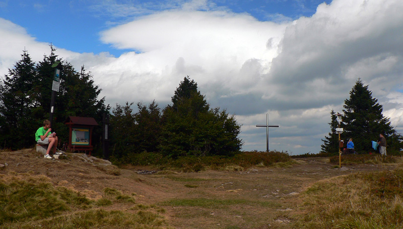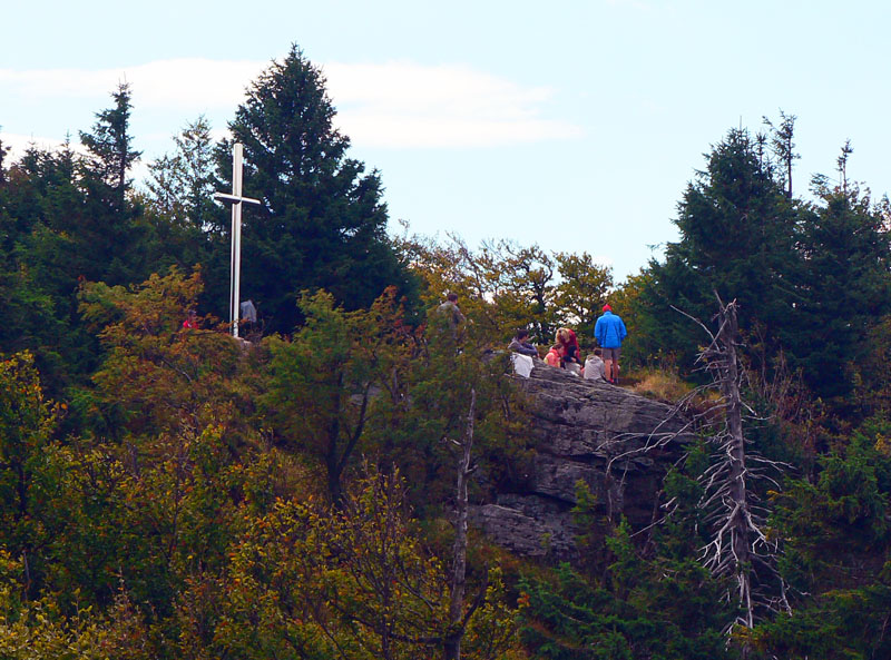 Pred Veľkým Gričom dvojkríž na trojvrší a kaplnka, ale hlavne poriadne rúbanisko a červená nikde. Od kaplnky na vrcholovú skalu to treba obísť zľava (od západu), po zvážniciach. Po žltej. A po plastových páskach s nápisom „zákaz vstupu“. Také príjemne recesistické :-)
