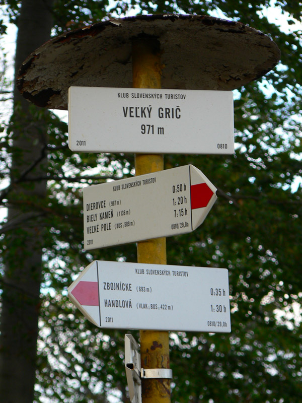 Veľký Grič – na brale kovová ružica s názvami pohorí a kopcov, Handlová hučí dolu pod nohami, čo by kameňom dohodil. Ale treba sa tam dostať okľukou a to je poriadna orientačná výzva. Červené značky smerom dolu sú hádam len zo dve a neomylne vedú do vysokej trávy rúbaniska. Takže lepšie je to nazad po žltej a nejakých 200 metrov po odpojení žltej zo zvážnice (ktorá klesá doľava) sa treba vrhnúť doprava dolu po spádnici, červený chodník sa nedá netrafiť. Potom už len dolu dolinou a cez banskú kolóniu do mesta.