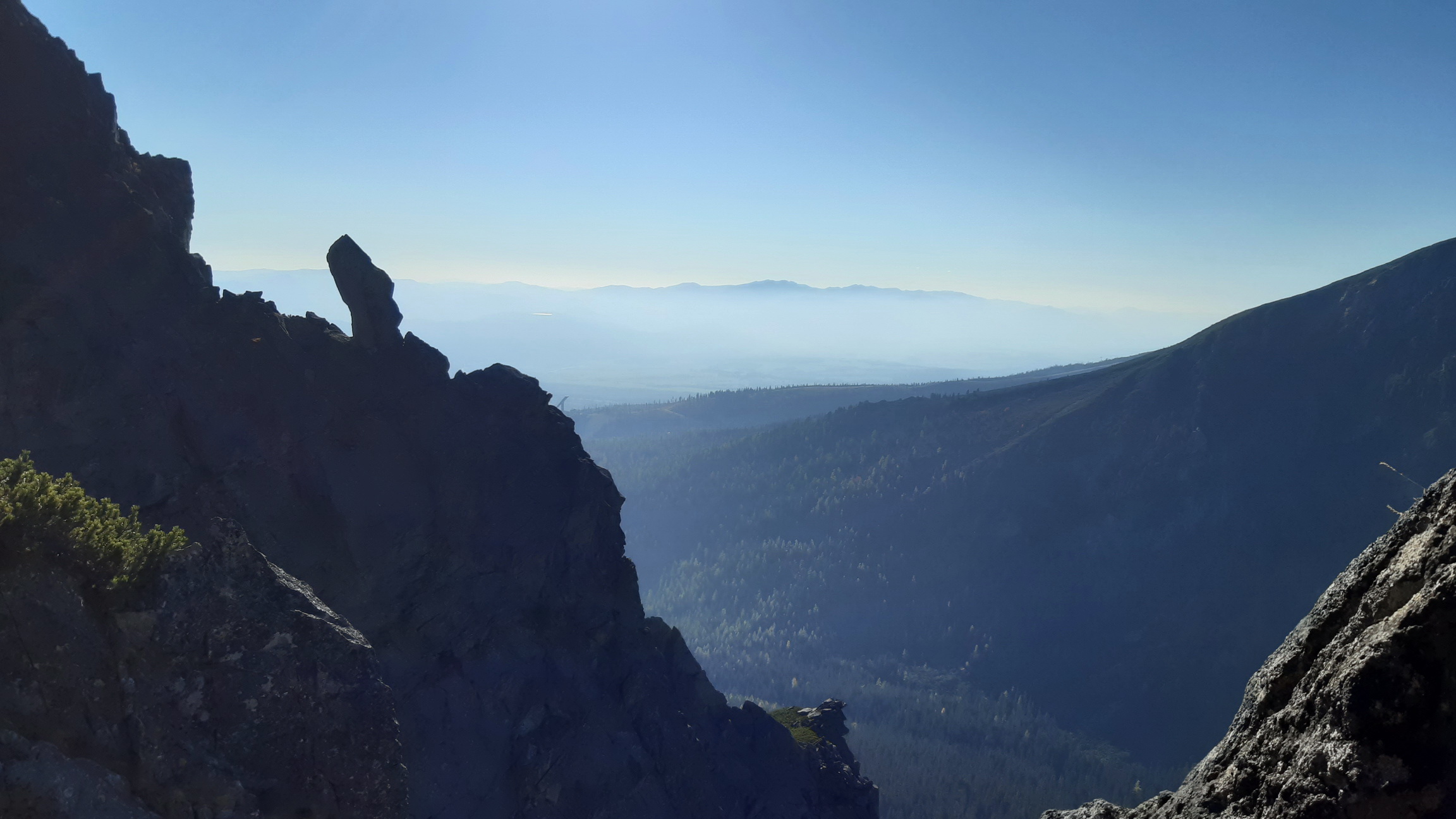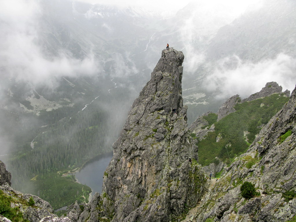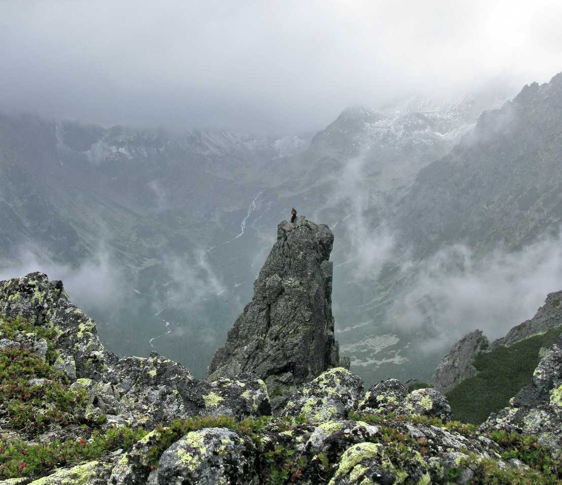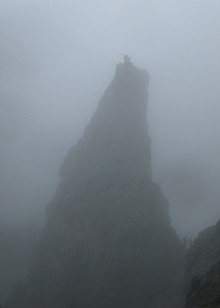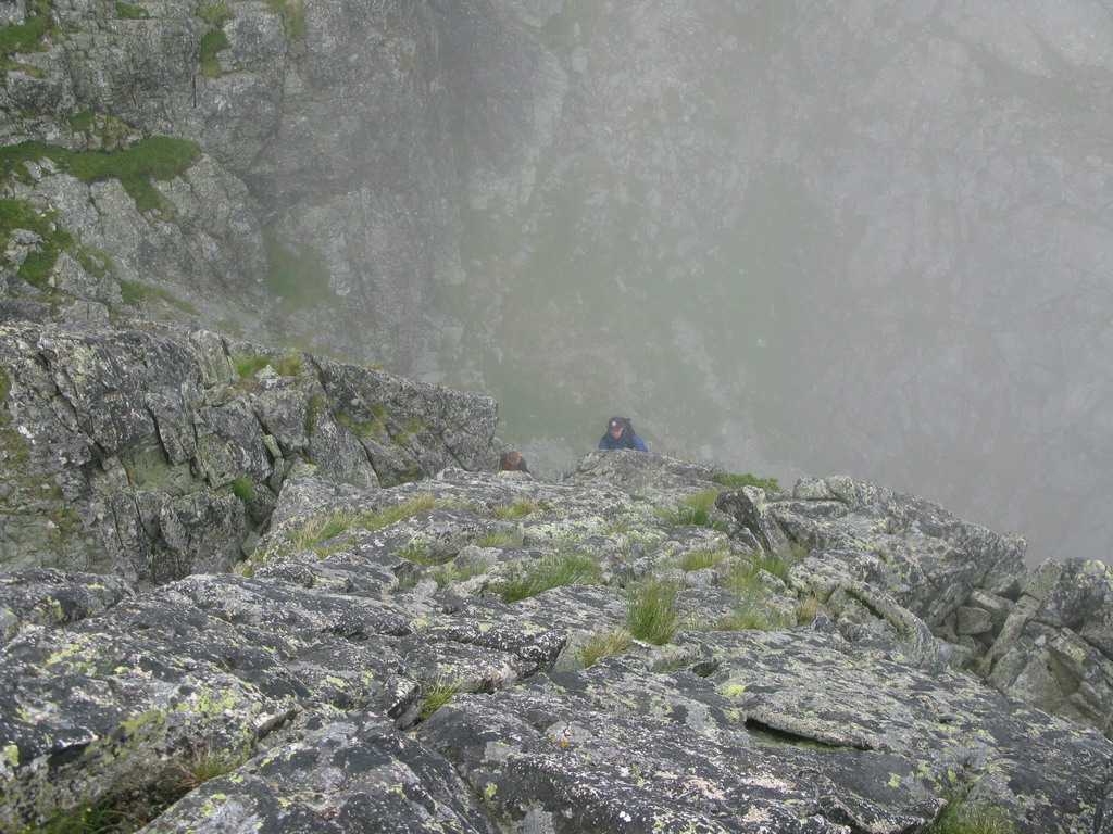 Našťastie sa hmla prevaľuje a z času na čas sa viditeľnosť zlepší. Prichádzame do sedielka odkiaľ sa nám otvorí výhľad na prízrak v hmle. Začína mrholiť, skala je vlhká. "Ideme na to !" hovorí kamarát do dažďa Vlado.