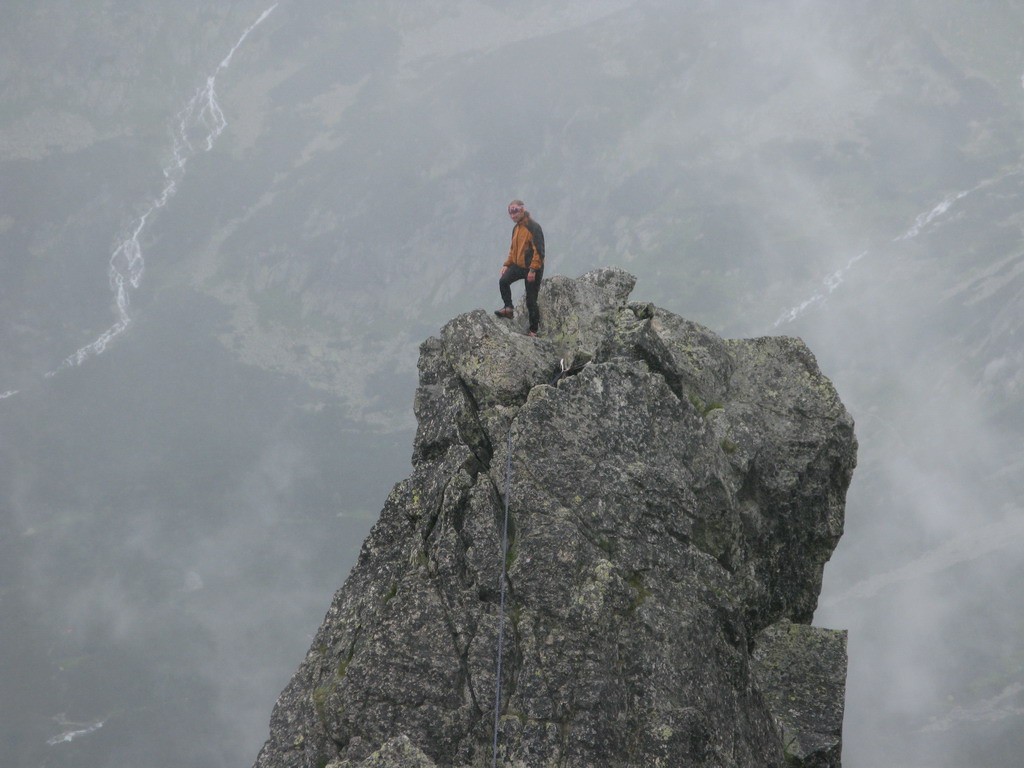 Predbehneme dvoch zúfalých Poliakov, ktorí si dávajú prilby a súkajú na seba kompletnú výstroj a rýchlo za začínajúceho dažďa zliezame pod nástup. Rovnako rýchlo sme hore. Chalani ostávajú na vrchole a ja sa rýchlo vraciam späť uloviť nejaké fotky. Nakoniec sa hmla trošku rozostúpi a výsledok si môžete pozrieť.