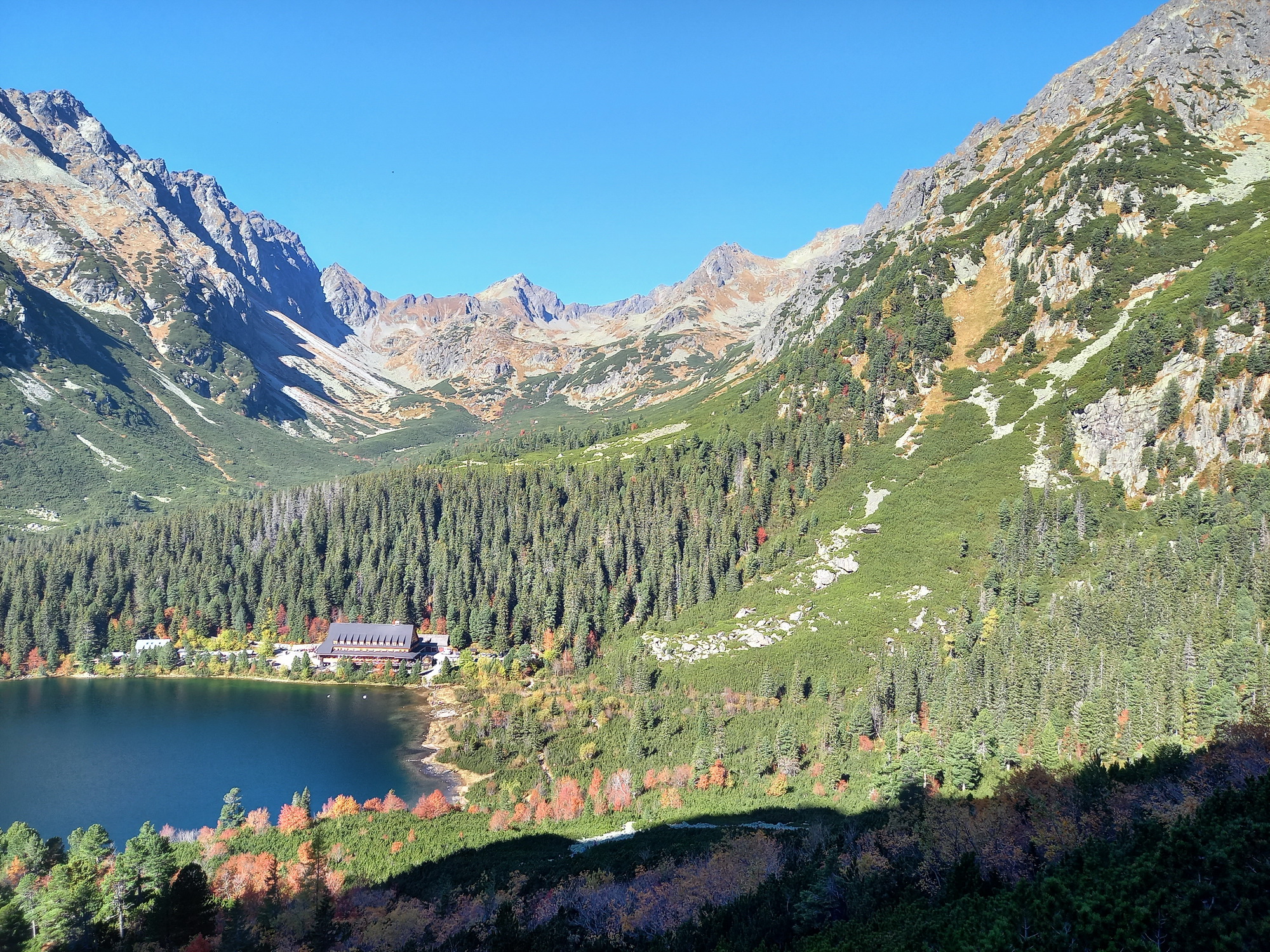 Ihla v Ostrve štýlom bike&hike. Parkujeme ešte pri hlavnej ceste pod Štrbským plesom, tu vyložíme bajky a po príjemnom asfalte vyšliapeme na Popradské pleso aj bez tretier. Na Majlátovej chate cez obed masaker. Odkladáme bajky a vydávame sa k nášmu cieľu.