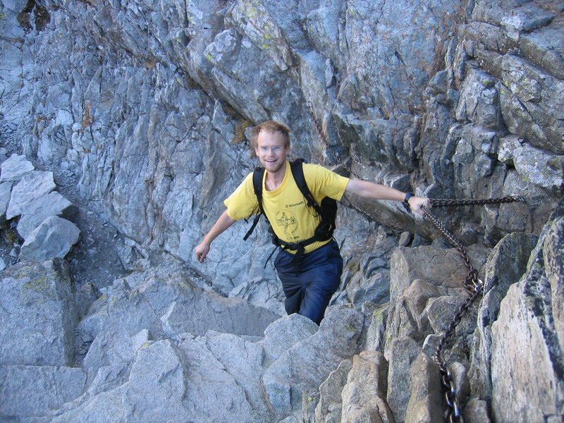 Som tu prvý raz a vychutnávam si nové výhľady. Mám tu ešte čo objavovať. V hornej časti na reťaziach sa dostávame znovu na slnko a to nám hneď dvíha náladu. Pod vrcholom nás míňajú poslední zostupujúci Poliaci a my si tak môžme vychutnať samotu na vrchole. Je taký nádherný deň, že sa nám nechce veľmi ponáhľať. Zastavujeme sa na Chate pod Rysmi. Dnes majú posledný deň prevádzku, čo nie je veľká výhra a tak sa po malom občerstvení vydáme ďalej.