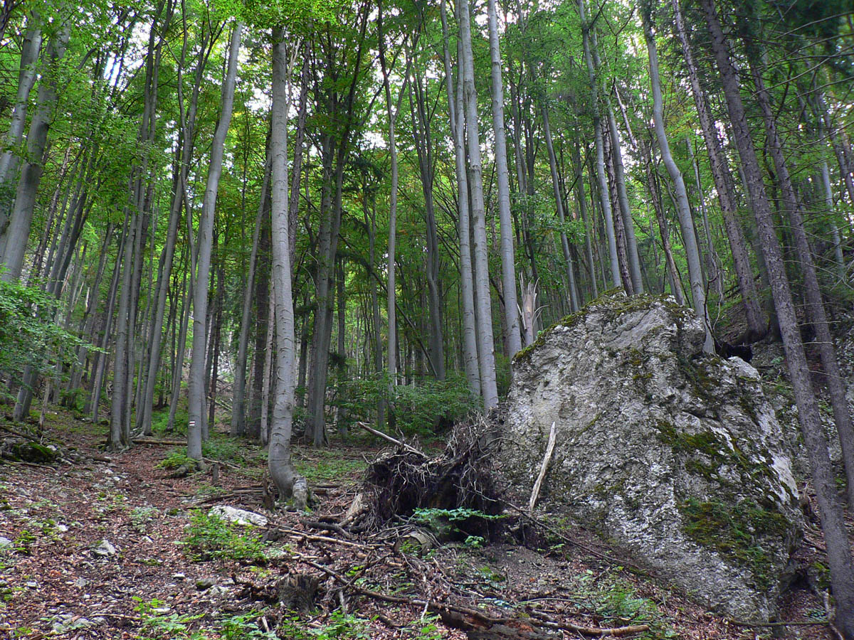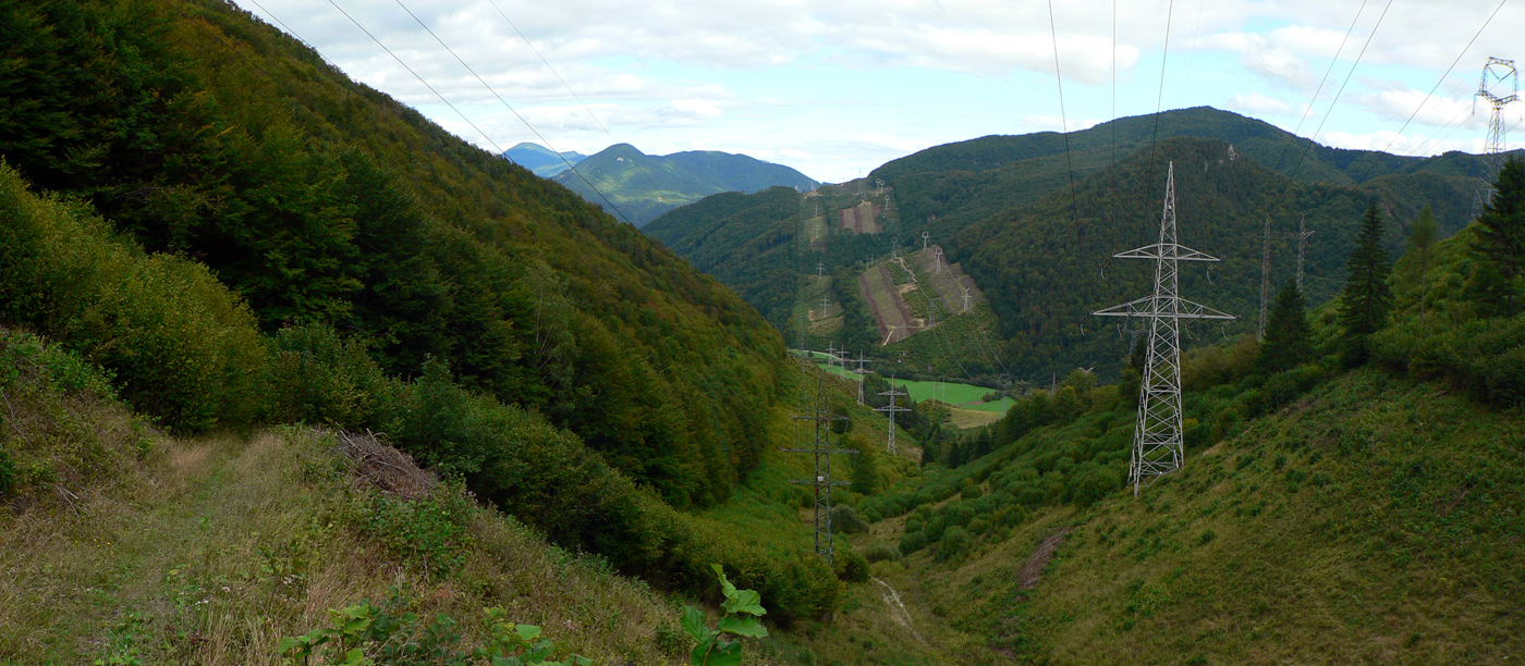 Z Kopy dole do Ľubochnianskeho sedla tiež nič moc. Podvrcholová lúka ponúka len obmedzené pohľady na hrebeň Veľkej Fatry a malý priehľad do Turca. Ale aj spoľahlivý prameň (aj koncom leta) na začiatku žltej značky. Naša červená, to je najprv prudký zošup lesným tunelom na zvážnicu, potom trochu rovinka na križovatku zvážnic a odtiaľ ďalšia, tentokrát poriadne rozbitá zvážnica „postkalamitnými“ rúbaniskami (zasa občasné priehľady do krajiny). Po krátkom stúpaní sa na chvíľu zmení na príjemný lesný chodník, vybehne na veľkú lúku a za stromami už vidno elektrické stožiare v sedle.