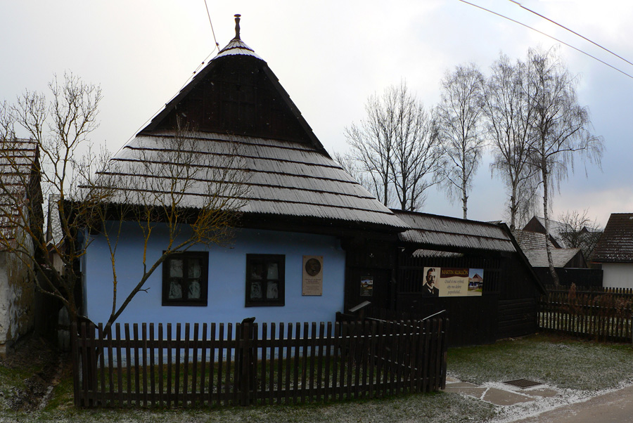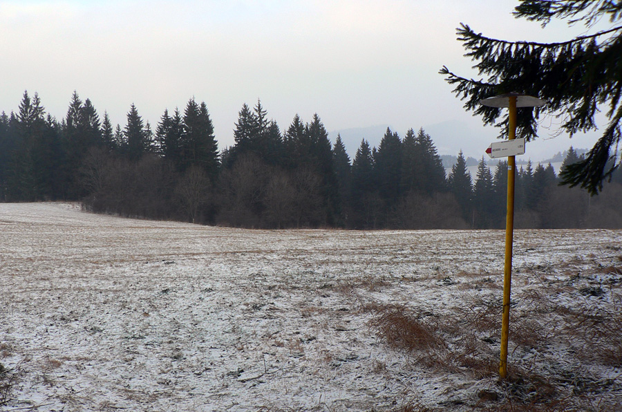 Prvý nápad: skryť sa na chvíľu do dediny, obísť Kukučínovo rodisko sa predsa nesluší! Aspoň trafím dáky smerovník. Ale nič! Keby som nevidel obrys Choča v mraku, netuším kade sa dať. Až nad dedinou pri ceste vyblednutá červená na drevenom smerovníku, ktorý udáva aj smer - ale do najbližšej reštaurácie. Tak stúpam opačným smerom po starej panelke, značky nikde. Smer je zatiaľ síce jasný, ale predsa len, nie každý sa tu vyzná...