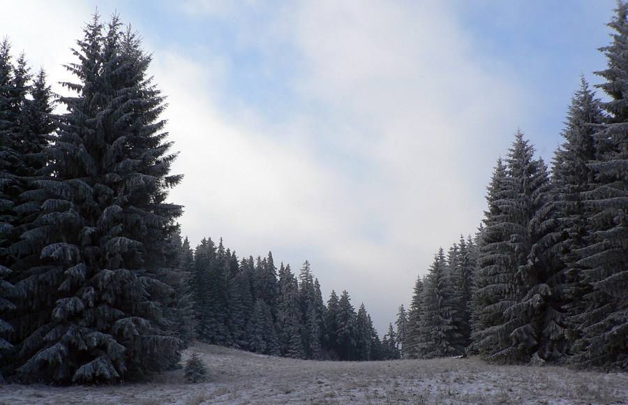 Nad Drapáčom pokračujem po červenej, sklon sa mierni, les redne, o 20 minút som na zimnej ceste zo Strednej poľany na Choč. A div sa svet, mordor a ničota ostáva za mnou, alebo skôr podo mnou: slnko, modro nad hlavou, bielo okolo. To biele je síce viac námraza ako sneh, ale aj to sa ráta v tejto biede. A hlavne: nefúka!