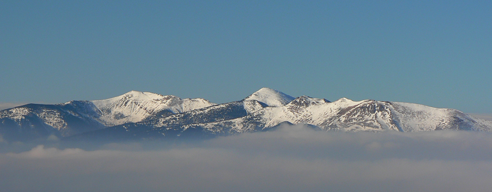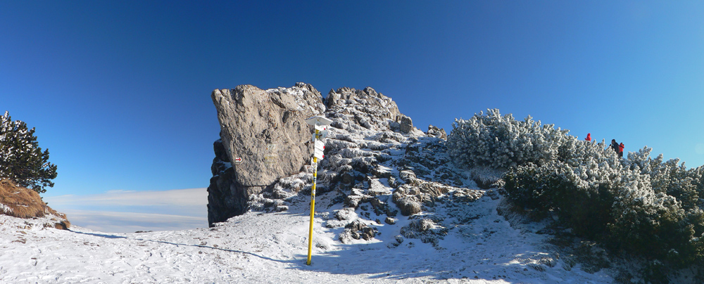 Ešte zo 40 minút, trocha šaškovania na klzkých kameňoch v strmáčiku s reťazami, trocha fotenia „mordoru“ a fatranských súostroví v diaľke a som hore - v slnku, bezvetrí (!!!), každý kto príde hore povie „jeeeeeeeeeeeeej“ a tasí foťák a rožky so salámou :-) Tak toto som nečakal, zdola to vyzeralo, že mraky ležia na vrcholoch kopcov. Pritom sa držia len v tenkej vrstve okolo 1000 - 1200m a nad tým azúro.