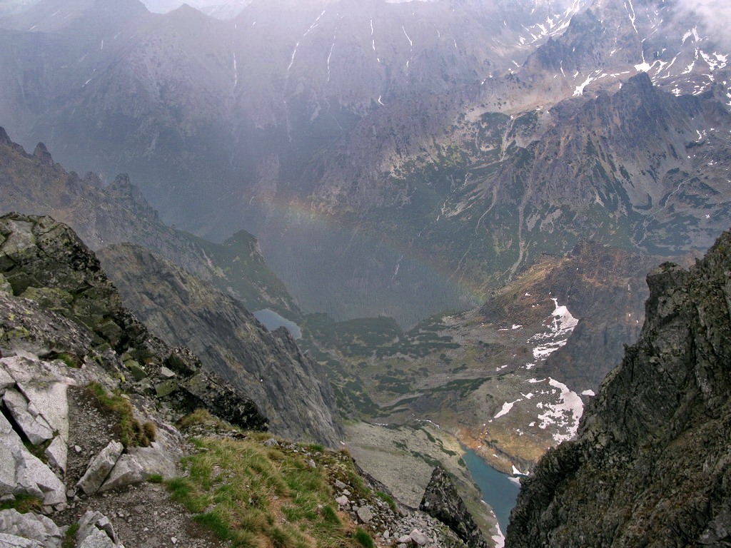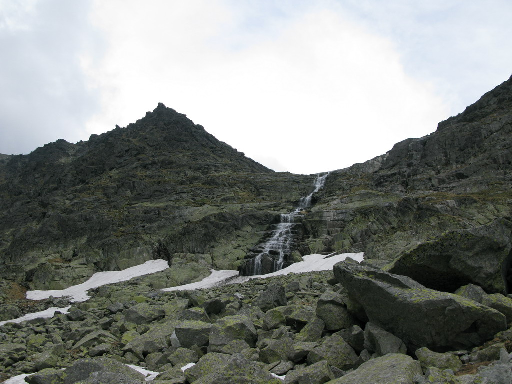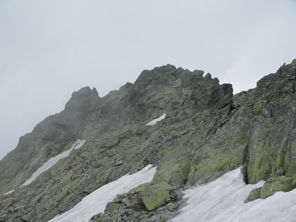 Pri Rumanových plieskach si ujasním ďalší plán: prejsť cez Kohútik, potom sa uvidí. Po ceste ale ešte odskakujem na Ťažký štít (Český). Stále neprší, len občas zaduní. Z Ťažkého štítu mám vrchol Rysov ako na dlani. Vidím vystupovať pár turistov. Ďalší cieľ je jasný. Najprv však musím prejsť cez Kohútik. Reťaze sú zčasti pod snehom, sedačku mám stále na sebe a tak neváham a rýchlo vyťahujem lano. Po šťavnatom traverze snehovým poľom mi už nič nestojí v ceste. Kúsok nad Váhou nechávam batoh pri železnej tyči a ďalej idem už len s foťákom - ako japonský turista.