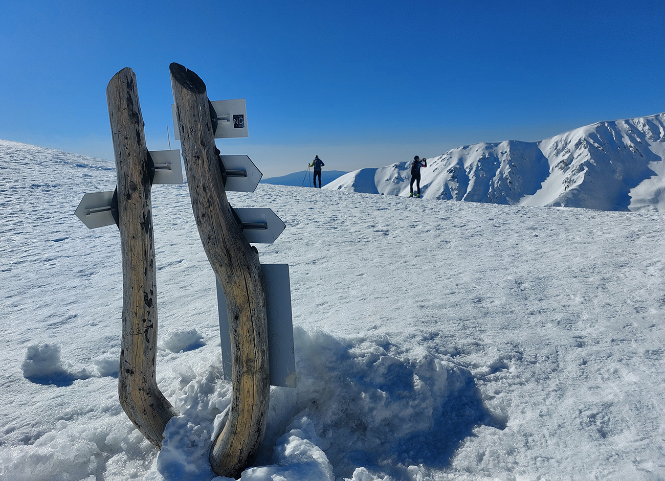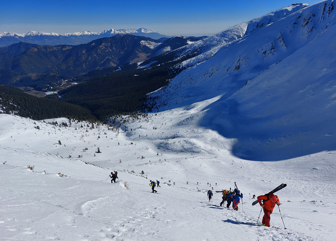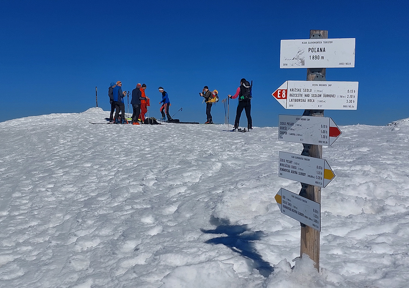 Sobota, siedmy marec, vyrazili sme do mierneho mrazíku z parkoviska P1 v Jasnej, smer Sedlo Poľany. Obloha gýčovito čistá, očakávaný úpek na južných svahoch. Severy vraj v top podmienke, uvidíme cestou hore. Plán bol okúsiť a zlyžovať takto zrána aspoň jeden juh niekde pod Kotliskami, potom pred páľavou utiecť do Derešských kotlov. Nakoniec to bolo mierne inak, ale nevadilo, aj keď nás mierne upieklo, poniektorých aj celkom na mäkko. A 2000 výškových je vraj celom dosť na takú prechádzku – no čo ja viem? Každopádne podobný nápad, ako sa dosať na hrebeň, malo v rovnakom čase doooosť veľa ľudí, ani sme sa nedivili. Lepšie ako po zjazdovkách. Keď sme potom popoludní po záverečnej zbehli dole, COROSy ukázali toto:
