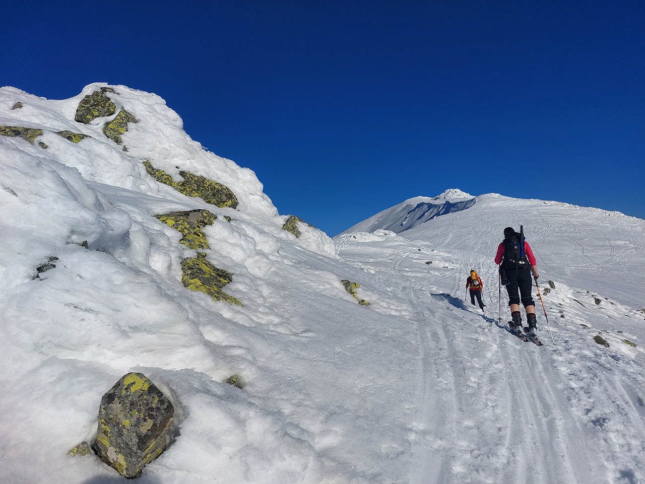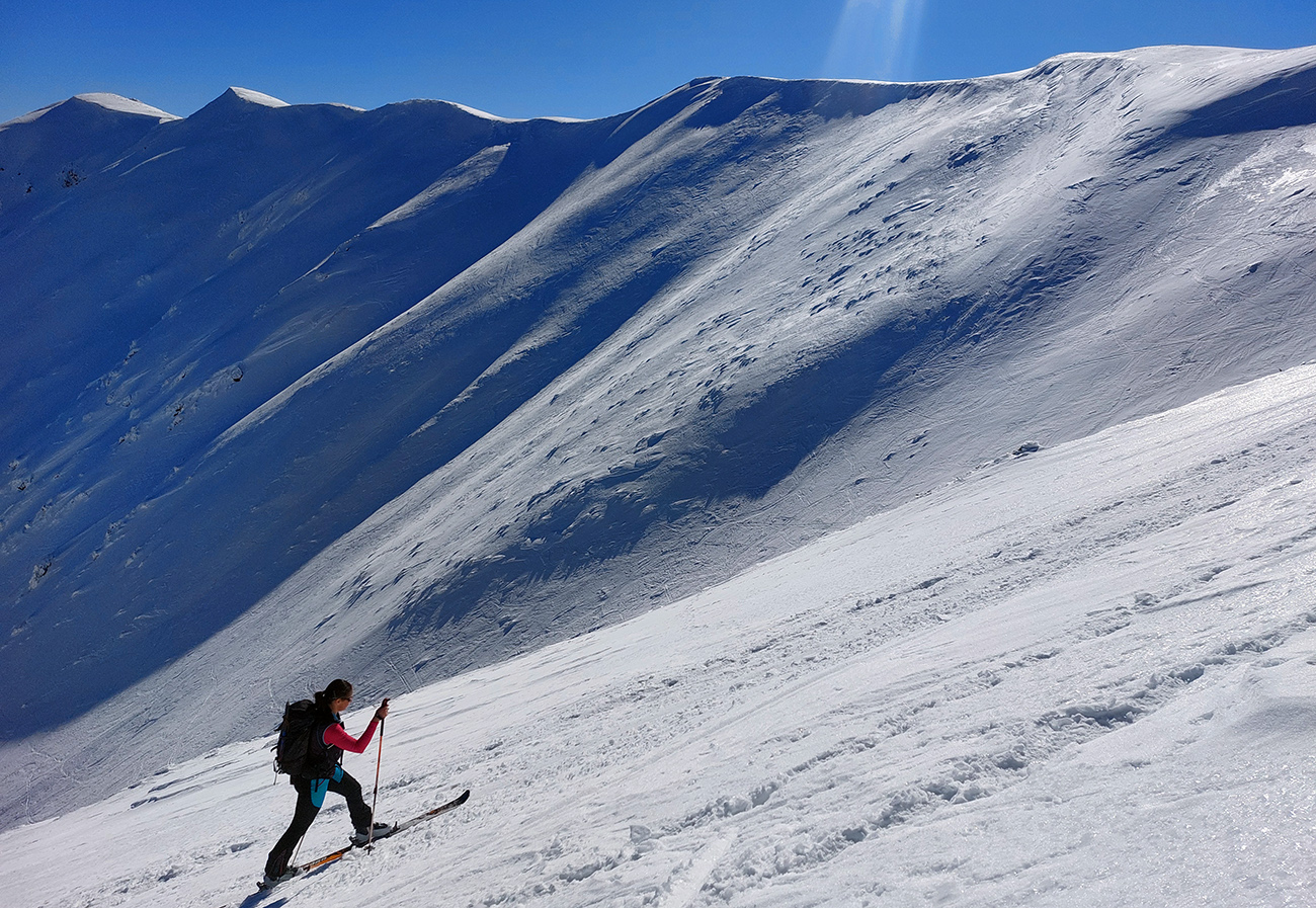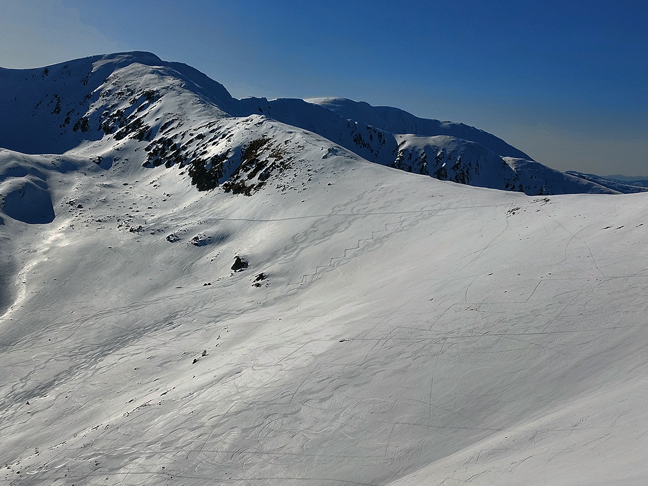 Sobota, siedmy marec, vyrazili sme do mierneho mrazíku z parkoviska P1 v Jasnej, smer Sedlo Poľany. Obloha gýčovito čistá, očakávaný úpek na južných svahoch. Severy vraj v top podmienke, uvidíme cestou hore. Plán bol okúsiť a zlyžovať takto zrána aspoň jeden juh niekde pod Kotliskami, potom pred páľavou utiecť do Derešských kotlov. Nakoniec to bolo mierne inak, ale nevadilo, aj keď nás mierne upieklo, poniektorých aj celkom na mäkko. A 2000 výškových je vraj celom dosť na takú prechádzku – no čo ja viem? Každopádne podobný nápad, ako sa dosať na hrebeň, malo v rovnakom čase doooosť veľa ľudí, ani sme sa nedivili. Lepšie ako po zjazdovkách. Keď sme potom popoludní po záverečnej zbehli dole, COROSy ukázali toto: