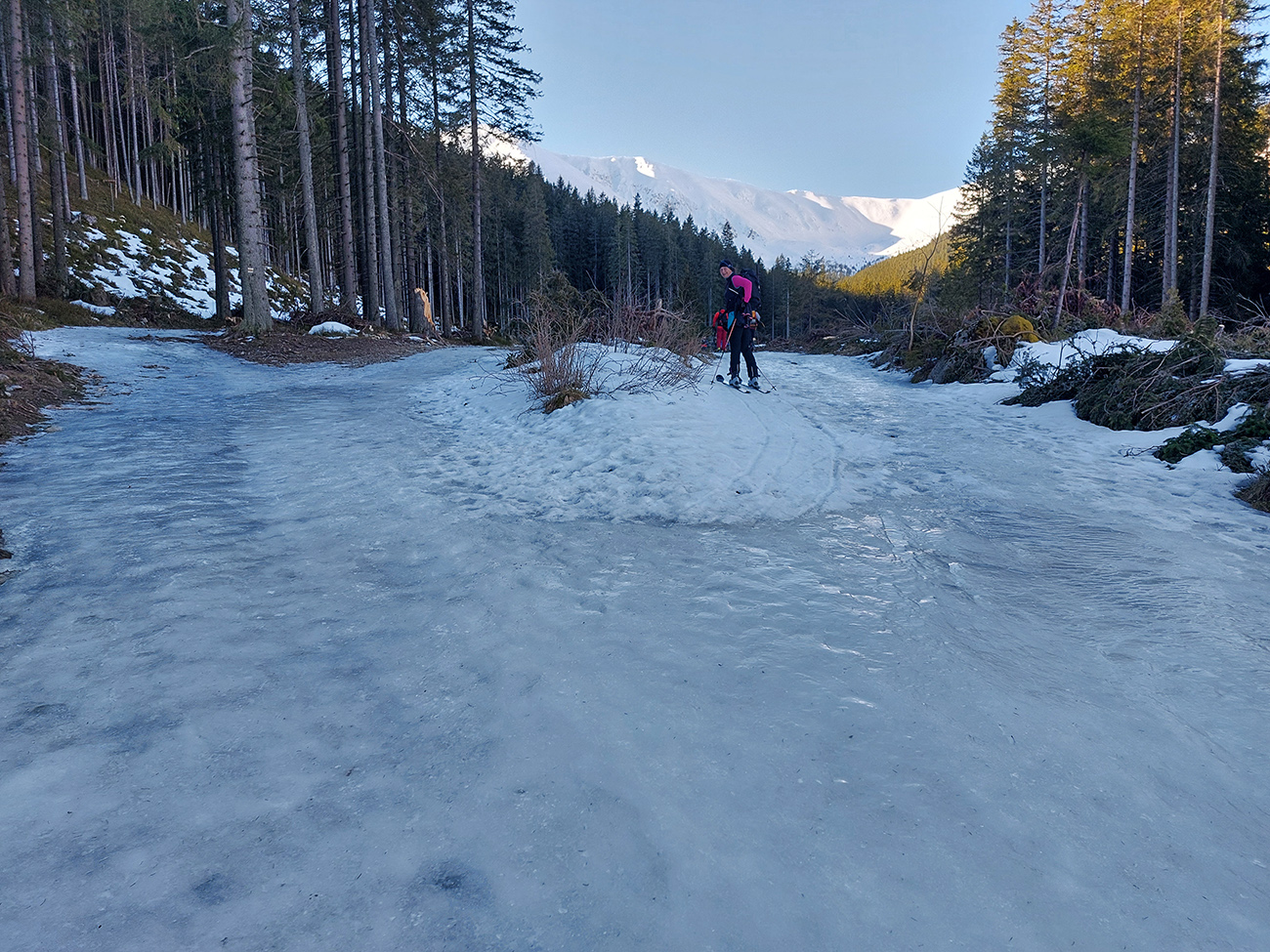 Najprv ale peši po prašnej ceste popri zasnežovacích nádržiach, tam sa už dalo pri smerovníku „Tri vody“ skočiť do lyží. Lepšie by ale boli korčule, niekde je tam aj seriózny, priesvitný ľad. V lese tiež fajne ľadovo, ruky dostali zabrať, aj pár malých obchádzočiek a „ľadovcových trhlín“ sa vyskytlo, na odbočku do traverzu potom pekne s lyžami v rukách po exkluzívnom a najmä strmom ľade.