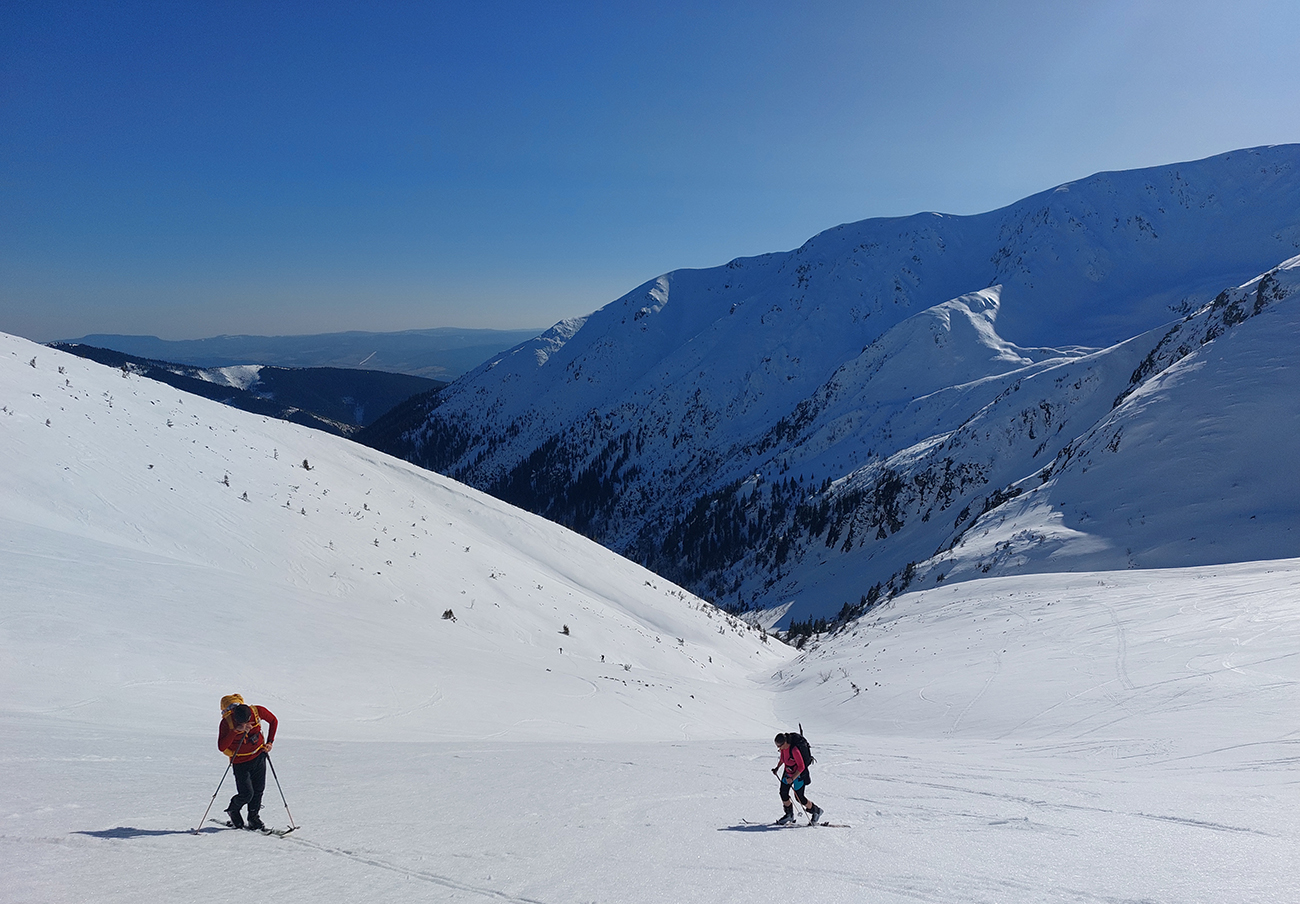 Ešte sme vyťapkali na Poľanu a nažhavení na jarné firny sme to odtiaľ stočili priamo dole po pláňach, niekam až tesne nad Vajskovský vodopád. Firny exkluzívne – na pevnom podklade natopená taká akurátna vrstvička, vôbec sa to ani v nižších polohách neborilo. Pre veľký úspech sme si to dali aj druhý raz, to už ale slnko dávalo poriadne cítiť svoju silu.